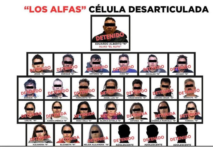 El secretario de Seguridad y Protección Ciudadana, Omar García Harfuch, anunció que este miércoles fue desarticulada una célula delictiva autodenominada «Los Alfas», vinculada a un grupo delictivo con orígenes en Jalisco y que operaba en el Valle de México. En las acciones, fueron detenidas 27 personas, entre las que sobresale Eduardo Alberto «N» alias El Alfa, presunto cabecilla.