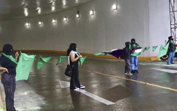 Un grupo de mujeres encapuchadas cerraron el paso a la circulación en el Viaducto del Parque Juárez en Xalapa durante la tarde de este domingo, en el marco del Día de Acción Global por el Aborto Legal.