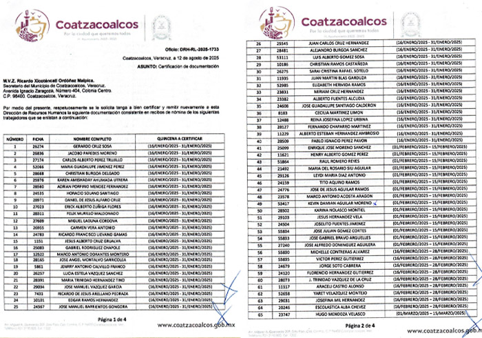 Un documento, suscrito por el director de Recursos Humanos, Luis Iván Hernández Caamaño, detalla el trámite para solicitar a la Secretaría del Ayuntamiento, a cargo de Ricardo Xicoténcatl Ordóñez Malpica, primo del alcalde, la certificación de los recibos de nómina de los beneficiados con las bases definitivas.