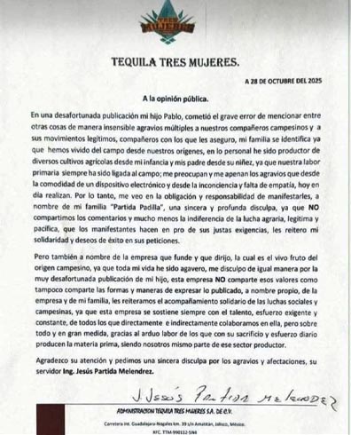 Frente al escándalo, Jesús Partida Meléndrez emitió un comunicado en el que lamentó las expresiones de su hijo y aseguró que su familia “no comparte ni respalda esas palabras”. El empresario explicó que sus raíces están en el campo, donde comenzó como agavero, y subrayó que su empresa se ha construido gracias al trabajo de los agricultores.